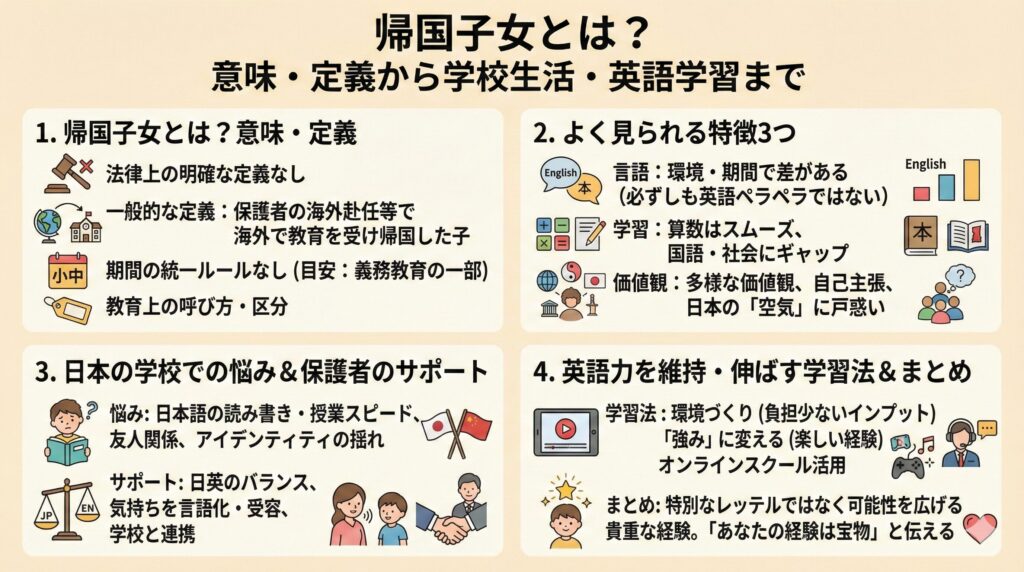 帰国子女とは何かという基本的な意味から、日本の学校生活でのリアルな悩み、そして英語力をどう維持・伸ばしていくかまで、できるだけわかりやすくお伝えします。